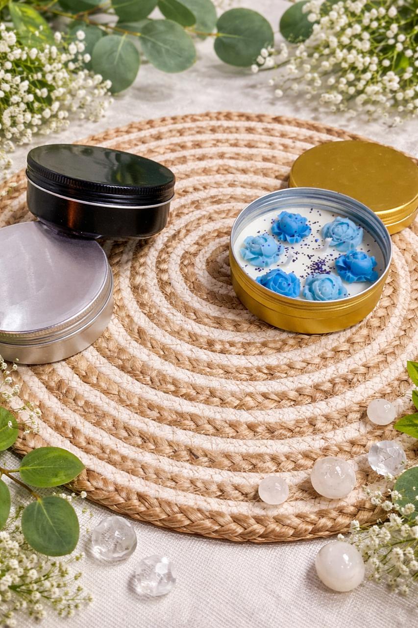 A stylish and portable Tin Jar Candle in a durable tin container with a lid—perfect for travel, gifting, and creating a cozy ambiance anywhere. 🕯️